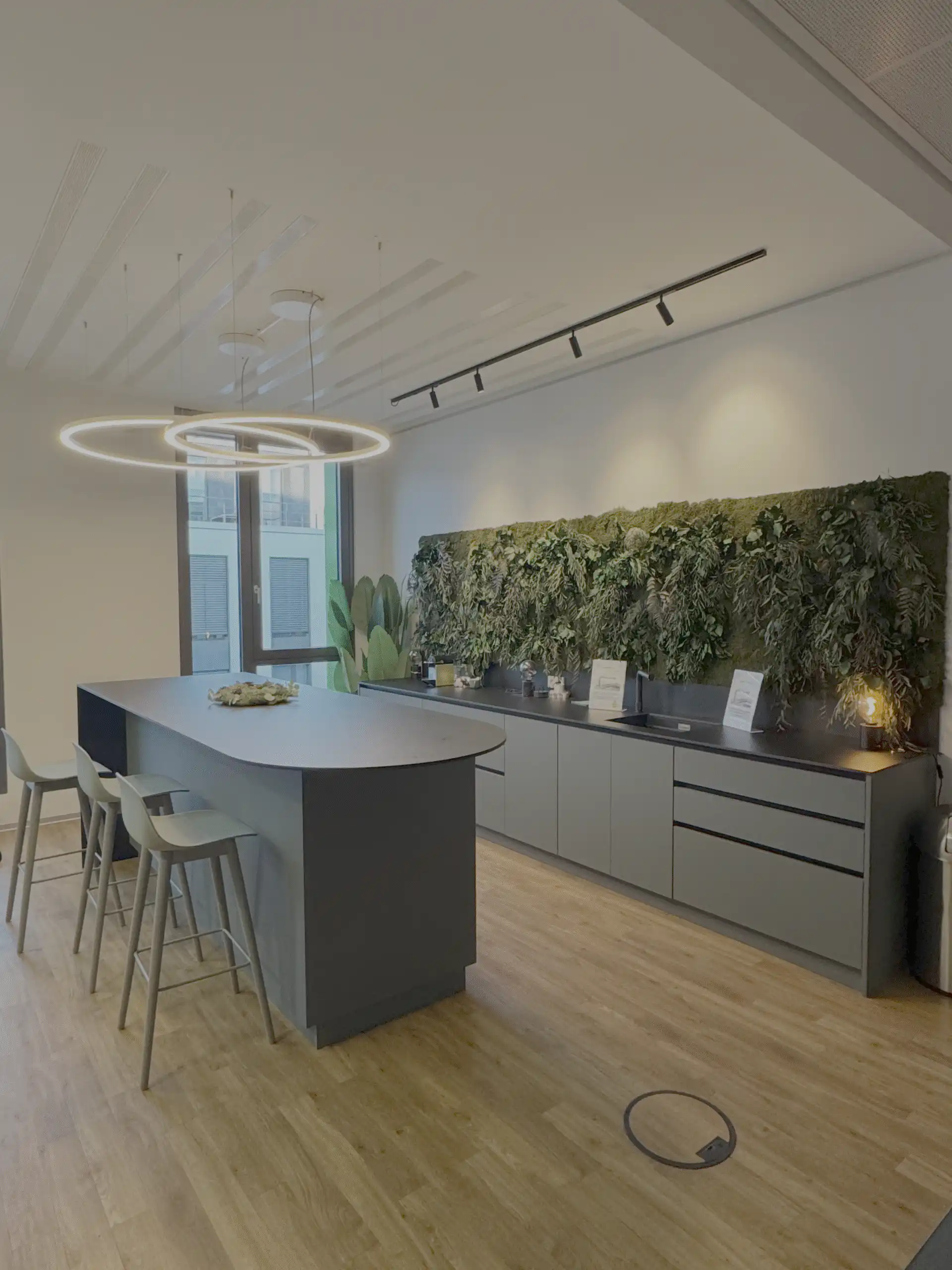 Für ein wachsendes Startup wurde ein moderner Meeting Point gestaltet, der als Treffpunkt und Austauschort für die Mitarbeiter dient. Der Bereich kombiniert Funktionalität mit hochwertigem Design und umfasst eine Theke mit Sitzmöglichkeiten sowie eine vollständig ausgestattete Küchenzeile.